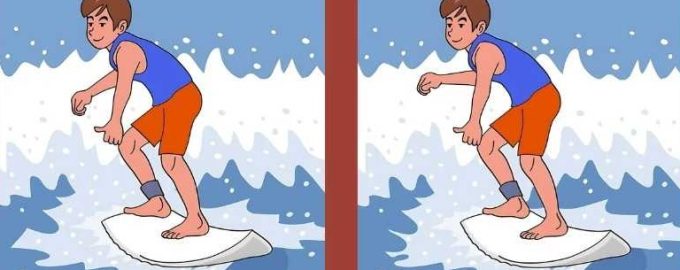 Pe imagine vedem un tip surfer care cucerește valurile pe o placă de surf. La prima vedere, poate părea că tipii din ambele poze sunt la fel, dar dacă te uiți cu atenție, devine clar că nu este așa – undeva există câteva diferențe care fac pozele diferite.