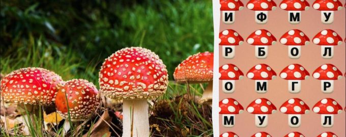 În colajul de mai jos, veți vedea zeci de litere aranjate pe muște mici în ordine aleatorie. Undeva în acest haos am ascuns cuvântul „fly agaric”.