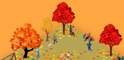 Imaginea arată un loc de joacă de toamnă unde se plimbă oameni și copii. Fiecare este ocupat cu treburile lui, dar lângă unii dintre ei sunt dovlecii pe care îi căutăm.
