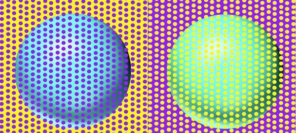 Bilele par diferite deoarece mingea din stânga este înconjurată de puncte violet pe un fundal galben, iar mingea din dreapta este înconjurată de puncte galbene pe un fundal violet.
