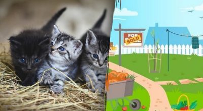 Răspuns corect. Una dintre pisici se ascunde într-o roabă, a dopisică adulmecă o floare, iar a treia pisică se odihnește pe un scaun.