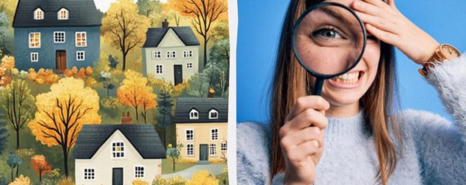 Mai jos veți vedea o imagine a unei zone rezidențiale cu case confortabile și copaci colorați. Sarcina ta este să găsești berze printre aceste frumuseți.