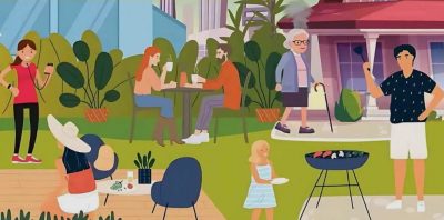 Aruncați o privire la imaginea de mai jos. Aceasta arată o scenă de petrecere în aer liber. Persoanele din imagine își petrec timpul relaxându-se, discutând și făcând grătar.