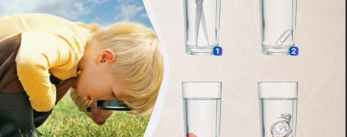 Astăzi Moje vă oferă un puzzle care poate fi rezolvat doar de persoane foarte atente. În fața voastră sunt patru pahare cu apă, în fiecare dintre ele fiind puse diferite obiecte: foarfecă, clips, elastic și un ceas de mână. Trebuie să determinați în mai puțin de 8 secunde care pahar are mai multă apă în el.