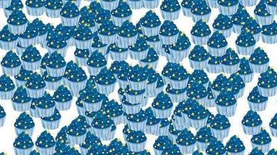 În această imagine puteți vedea un lot de cupcakes proaspăt coapte. Toate cupcakes-urile au ploaie de stele deasupra. Dar una dintre prăjituri are o lună deasupra, pe lângă stele.
