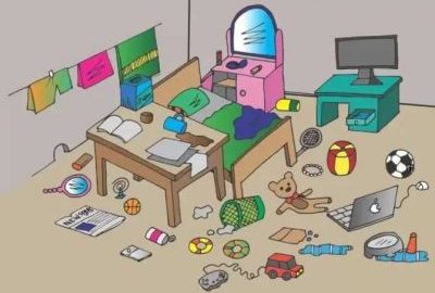 În imagine este o cameră. În ea, pe podea, cineva a lăsat o mulțime de obiecte diferite. Printre aceste obiecte sau în apropierea lor se ascunde un păianjen, pe care îl căutăm.