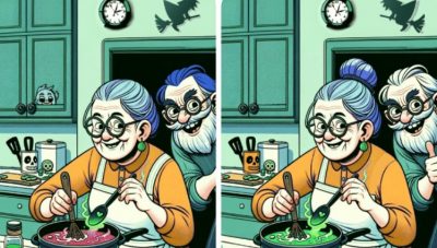 În imagine vedem o bunică care gătește mâncare și un bunic. Amândoi zâmbesc și își arată dispoziția optimistă. Bucătăria are o atmosferă de armonie și familiaritate creată de cuplul în vârstă.