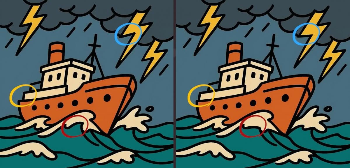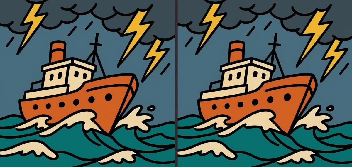 Așadar, ești pregătit pentru următoarea provocare? Uită-te cu atenție la două imagini ale unei nave care navighează prin furtună. Imaginile pot părea exact la fel, dar nu te lăsa păcălit. Există trei diferențe ascunse. Trucul este că ai la dispoziție doar 65 de secunde pentru a le găsi pe toate. Încearcă și testează-ți acuitatea viză!