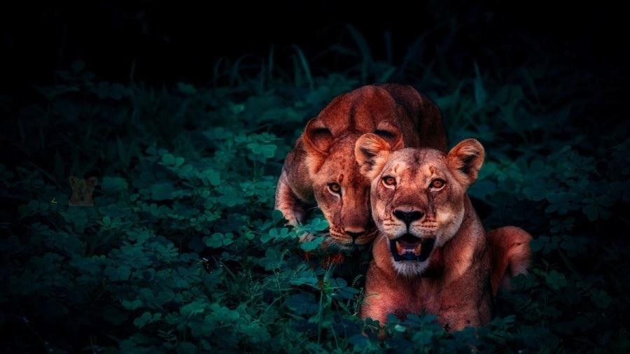 În imagine vedem două leoaice, dintre care una se furișează asupra celeilalte. La prima vedere pare că nu mai este nimeni în imagine în afară de leoaice, dar nu este așa. Undeva se ascunde un pui de leu, pe care nu toată lumea îl poate vedea.