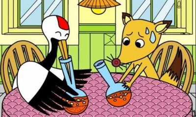 În imagine vedem o scenă din celebra poveste a vulpii și cocorului. În timp ce cocorul consumă bucuros hrana dintr-un flacon îngust, vulpea doar privește cu invidie recipientul din care nu poate obține mâncarea gustoasă.