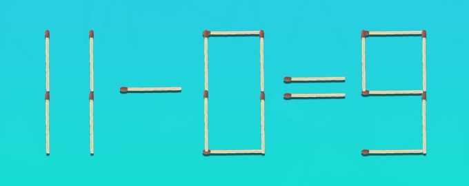 Deci, în fața ta – o egalitate incorectă: 11 – 0 = 9. Ea este formată din 19 chibrituri. Dacă mutați unul dintre ele, egalitatea devine corectă. Sarcina poate fi îngreunată prin limitarea îndeplinirii ei la un anumit timp, de exemplu 15 secunde.