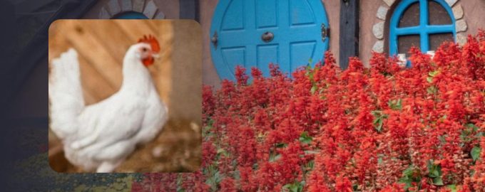 Găina poate fi văzută în partea stângă a fotografiei, este foarte bine ascunsă printre florile roșii de la intrarea în cabană.
