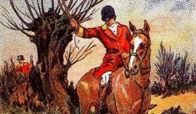 În imagine sunt vânători pe cai, lângă unul dintre ei sunt trei câini. Lângă vânător este o vulpe. Asta este ceea ce trebuie să găsim.