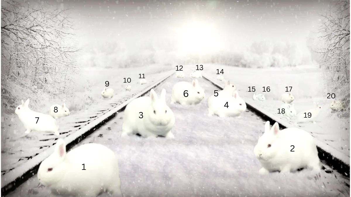 Imaginea arată iepuri din afara orașului care aleargă peste calea ferată. Sarcina ta este să îi numeri și să găsești numărul corect.