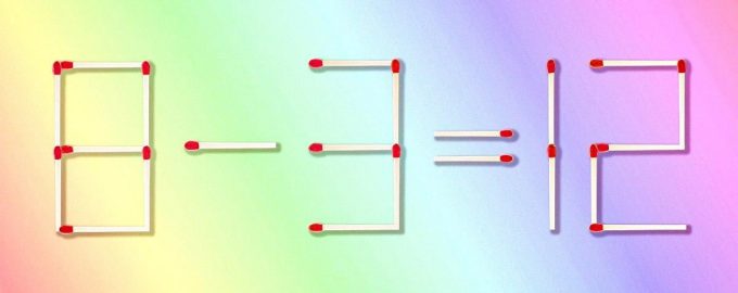 Așadar, în fața ta se află o ecie incorectă: 8 – 3 = 12. Ea este formată din 22 de chibrituri. Trebuie să mutați unul dintre ele în alt loc pentru a corecta ecia.