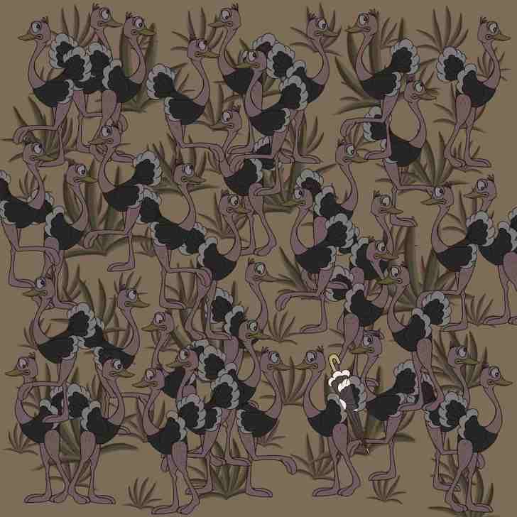 La prima vedere poate părea că nu există nimic altceva în imagine în afară de struți, dar nu este așa. Undeva există cu siguranță o umbrelă, doar că este dificil să o observi, deoarece ascunzătoarea sa este foarte bine camuflată.