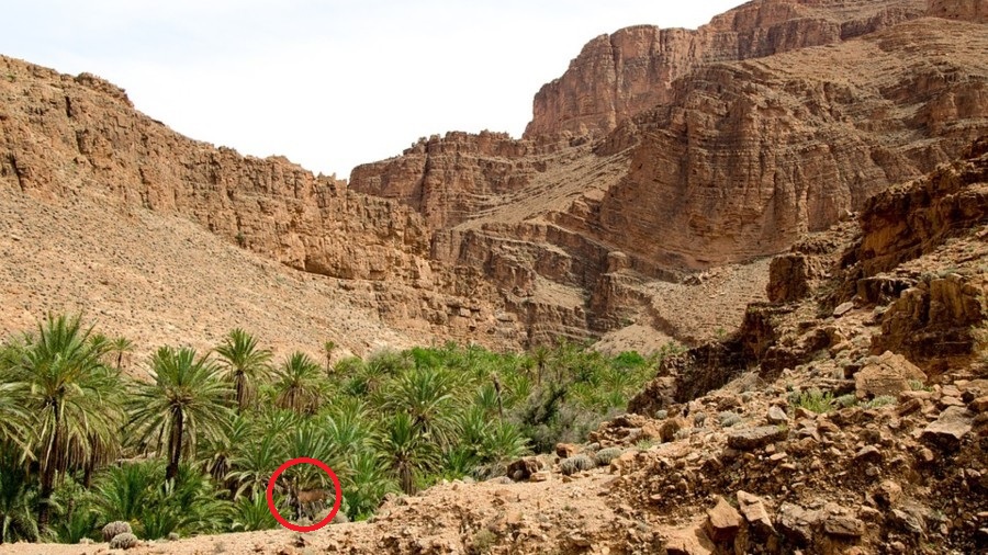 În imagine vedem munți, la poalele cărora există o mică zonă cu vegetație. Dacă te uiți pentru prima dată la fotografie, pare că nu există niciun suflet viu acolo – doar stânci singuratice și o mulțime de pietre. Dar, de fapt, există un animal ascuns printre această natură neatinsă – o capră. Doar cei mai atenți oameni o vor putea observa.