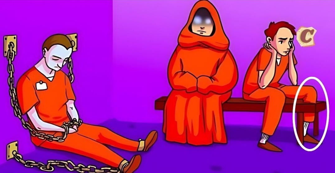 În imagine vedem trei persoane care stau într-o celulă de închisoare, având pe ele haine de închisoare de culoare portocalie. Unul dintre prizonieri stă pe podea și este legat cu lanțuri de perete, iar ceilalți doi stau pe o bancă.