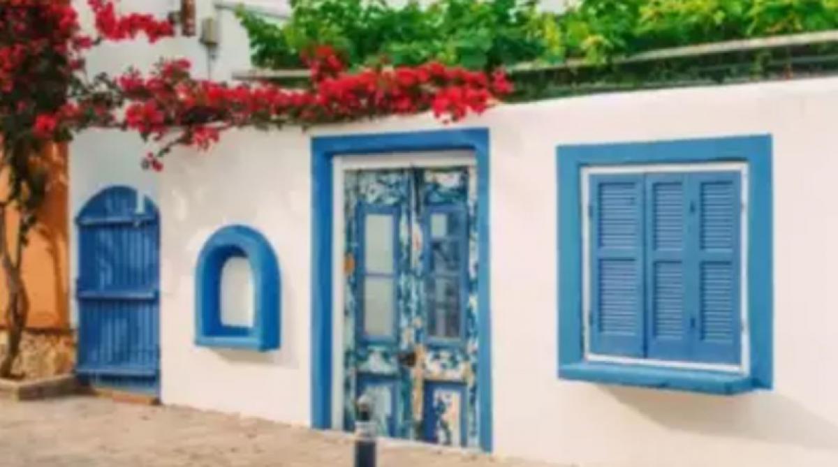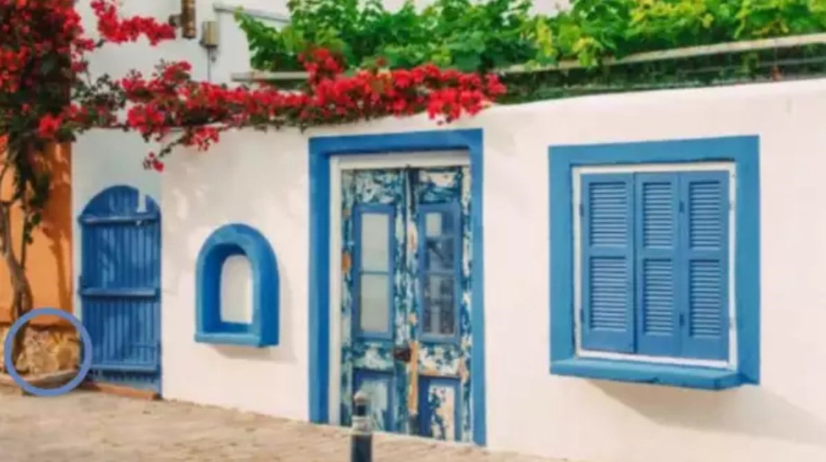 Imaginea arată o casă din Grecia cu o pisică lângă ea. Sarcina ta este să găsești animalul în 10 secunde.