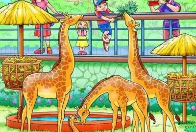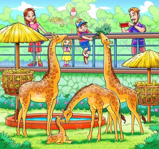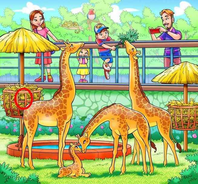 Imaginea este a unei familii la grădina zoologică. Bărbatul filmează girafele cu telefonul, iar copiii și soția lui se uită la animale. Undeva este ascunsă o maimuță, pe care trebuie să o găsiți.
