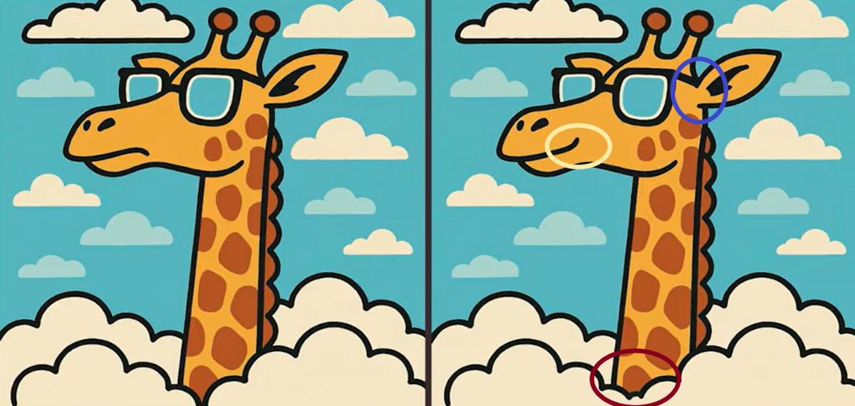 Așadar, ești pregătit pentru următoarea provocare? Uită-te atent la cele două imagini cu girafa care poartă ochelari. La prima vedere, ele pot părea la fel, dar există 3 mici diferențe. Crezi că le poți găsi pe toate în 23 de secunde? Încearcă și testează-ți acuitatea viză!